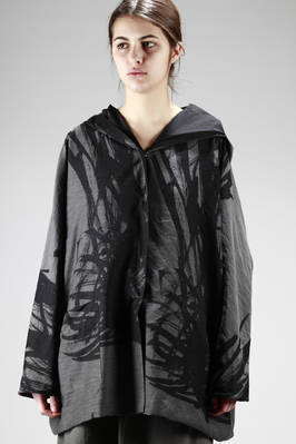 caban ampio e doppiato: un lato in tela ad effetto garza di cotone, rayon e seta con stampa a 'spennellate' e un altro in tela di poliestere waterproof a tinta unita, un petto con cappuccio, due tasche applicate laterali al fondo, chiusura con bottoni a pressione, lunghezza sotto al fianco, reversibile, taglia francese