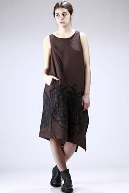 abito ampio, longuette in tela ad effetto garza di cotone, rayon e seta con stampa a 'spennellate', senza maniche, girocollo ampio, tasche a filo verticali ai lati, spacco laterale, fondo diagonale, linea asimmetrica, taglia francese