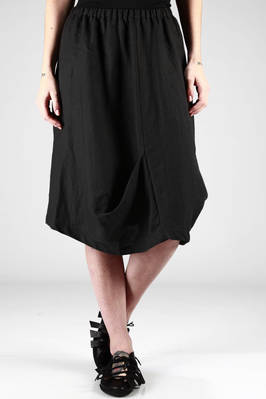 gonna sotto al ginocchio in tela pesante di lino, elastico in cintura, pieghe asimmetriche cucite al fondo ad effetto tasche, linea lievemente ad anfora, taglia francese
