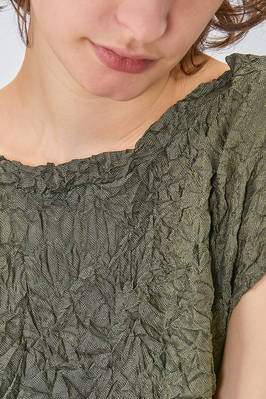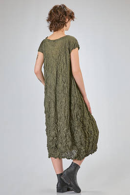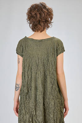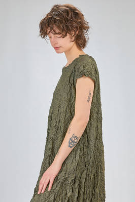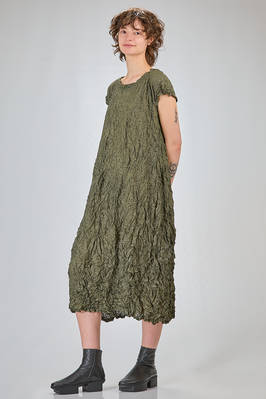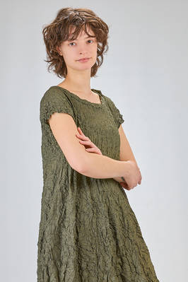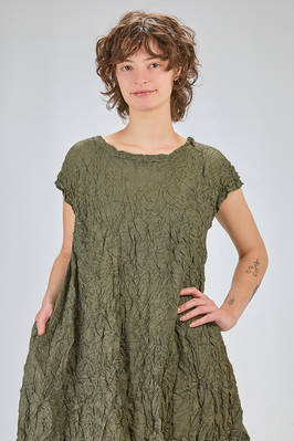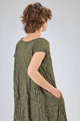 abito longuette, ampio e svasato, in froissé leggero di poliestere garzato, girocollo, manica corta scesa, tasche a filo verticali ai lati. La modella è alta cm. 170 e indossa una taglia francese 38