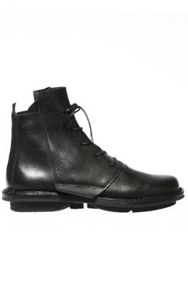polacchino tipo anfibio in pelle morbida di vacchetta, pattina ai lati sfalsata, chiusura con lacci, suola classica in gomma antiscivolo con punta arrotondata