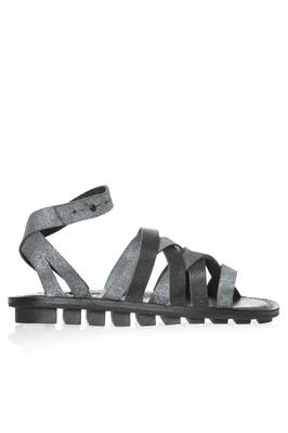 sandalo in morbida pelle di vacchetta intrecciata 'dritto/rovescio' con tonalità diverse, fascette intrecciate sul davanti e sul retro, chiusura laterale alla caviglia con bottoncino, classica suola in gomma arrotondata con livelli paralleli al fondo