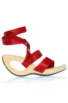 zoccolo alto in morbida pelle di vacchetta, due fascette diagonali e chiusura con fascetta arrotolata alla caviglia con velcro, tacco in legno (cm. 8) con foro ovale e gomma anti-sdrucciolo al fondo