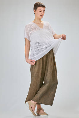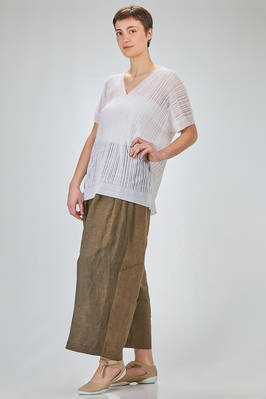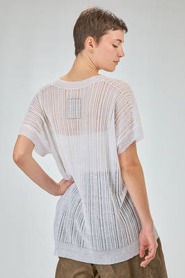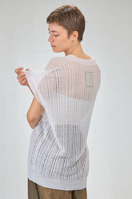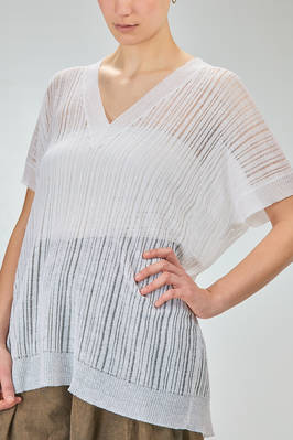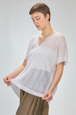 maglia lunga e ampia in garza lavorata a righe verticali vuote e piene di lino e poliammide, profondo scollo a v a costine, manica scesa con costine al fondo, fondo a costine. La modella è alta cm. 180 e indossa una taglia M