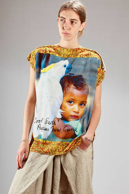 t-shirt ampia con 2 rettangoli di tessuto accostati: davanti in seta con stampa 'Papua Nuova Guinea' e dietro in jersey di cotone a tinta unita, collo a barchetta, 2 spacchetti laterali, manica ad aletta, profili a taglio vivo, indossabile davanti/dietro