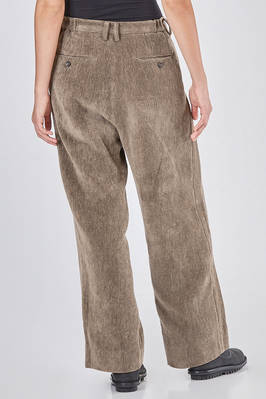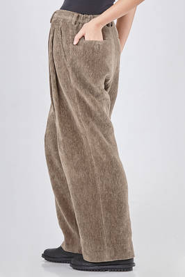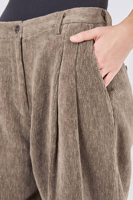 pantalone ampio in velluto a coste ravvicinate di cotone e lino melange, interamente foderato con parti in cotone e cupro, passanti per cintura, chiusura con zip e bottone, lunghe pinces verticali sul davanti, tasche a filo diagonali ai lati e orizzontali con bottoncino sul retro. La modella è alta cm. 180 e indossa la taglia 38