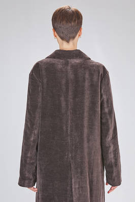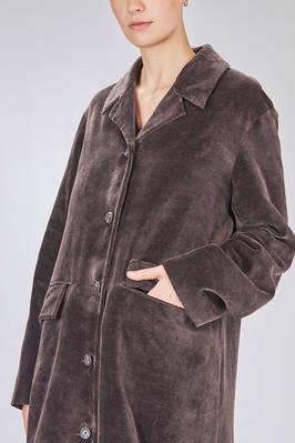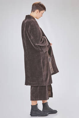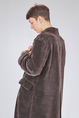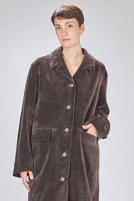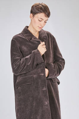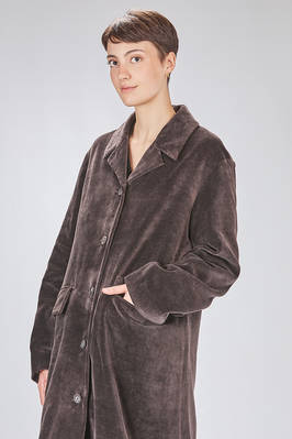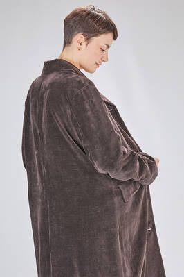 cappotto sotto al ginocchio, ampio e lievemente svasato in velluto liscio a mano morbidissima di carta tessile e cotone, foderato a patchwork stampati di lino e lana, cotone, cupro e seta, un petto con rever, chiusura con bottoni, tasche con pattina, spacco centrale posteriore. La modella è alta cm. 180 e indossa la taglia 38